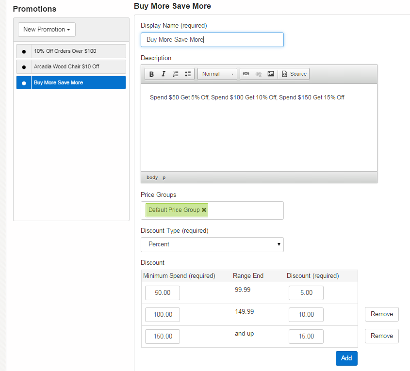 - Users can choose which Price Groups should be associated to which promotions and which shipping methods
