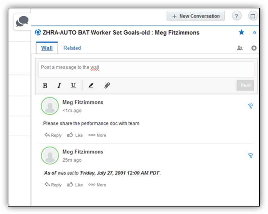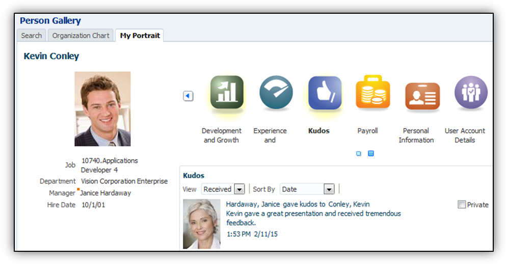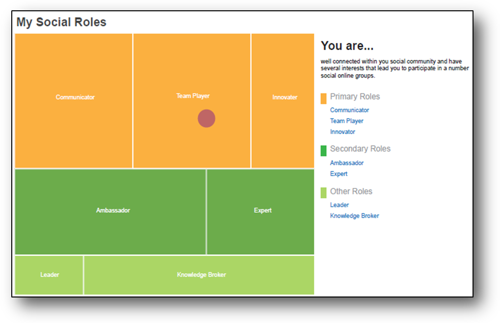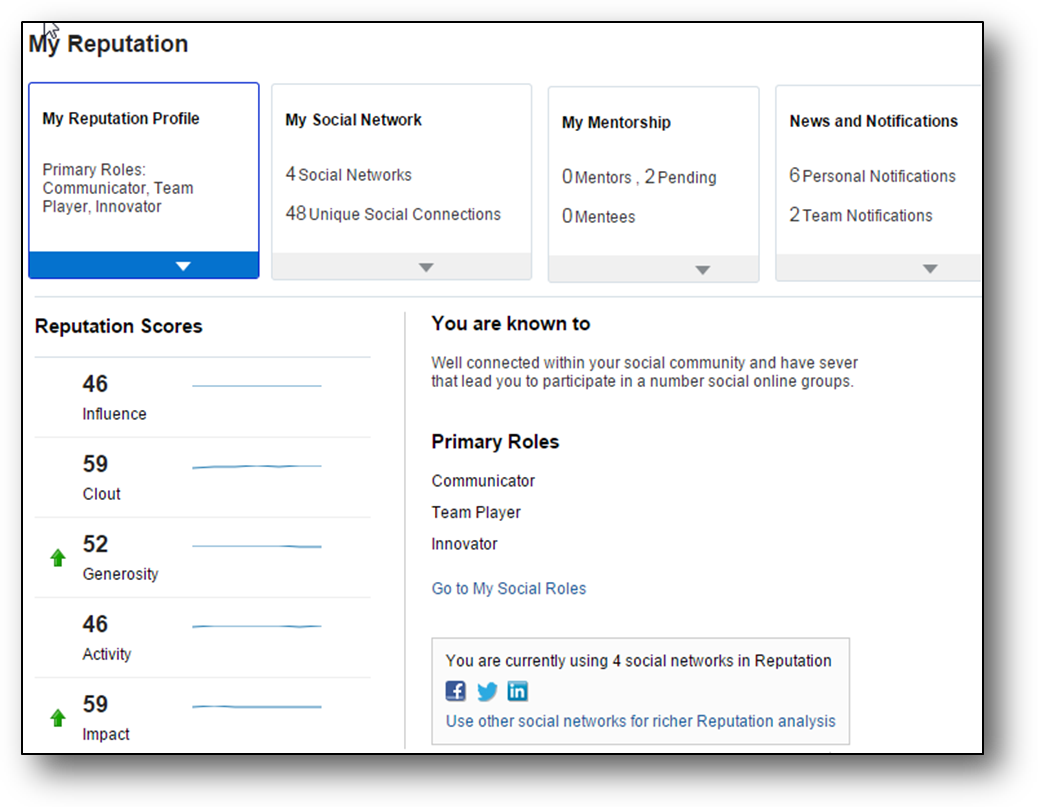 Employees can now access their reputation scores which were only available to managers in previous releases. They also have access to a new view of their social roles which is also based on their online social behaviors. Social roles complement reputation scores allowing workers and managers multiple views of a person’s online social reputation. An employee can attain the following social roles: Ambassador, Communicator, Expert, Innovator, Leader, Knowledge Broker, and Team Player. Employees are presented with information about the role they socially represent and how it relates to their social networking behaviors.