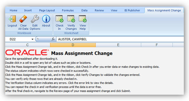Oracle Fusion Global Human Resources: Buttons Relocated to Ribbon in Mass Assignment Change Spreadsheet |