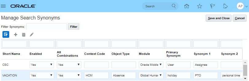 - Synonym Object Type: A business object name that would determine the subset of synonyms to search on.
