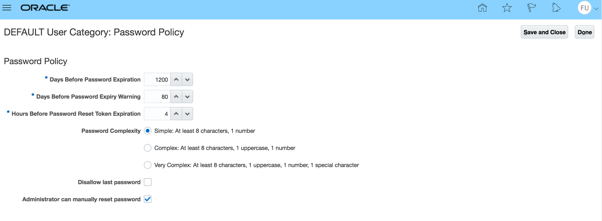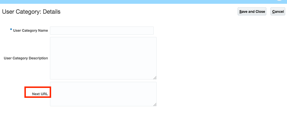 NOTE: You can specify only one URL in the field. All users assigned to that user category are redirected to the specified URL. If the Next URL is not specified for a user category then there is no change in the existing password reset functionality. Upon reset, users are taken back to the Oracle Fusion Applications sign in page.