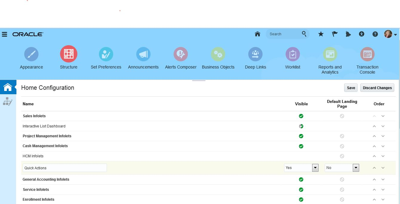 An administrator can configure the default landing page using the Home Configuration tab of the Structure work area.