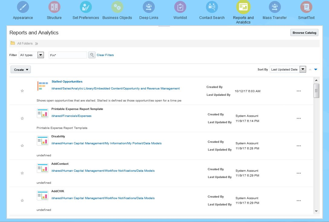 The Reports and Analytics work area provides enhanced, content-rich access to your reports and analytics through its improved search and filter capabilities and intuitive navigational flows. The interface is simpler and more modern, with easy access to your commonly used objects and recent searches.