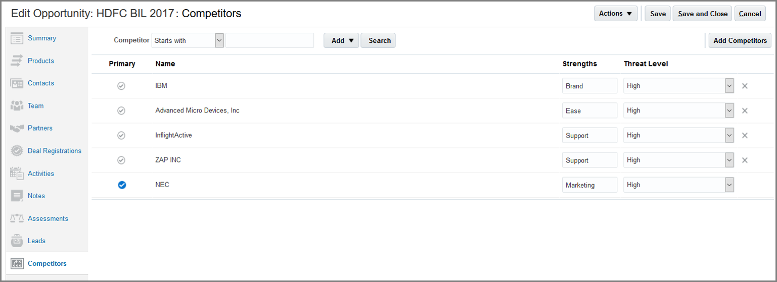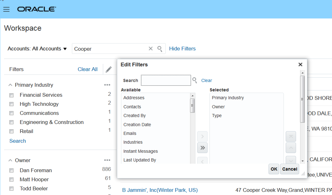 Optimize the performance of search results in work areas and perform keyword searches extremely quickly. Workspace provides enhanced search capabilities across all core sales objects, such as Accounts, Contacts, Leads, Opportunities, Assets, and Activities.
