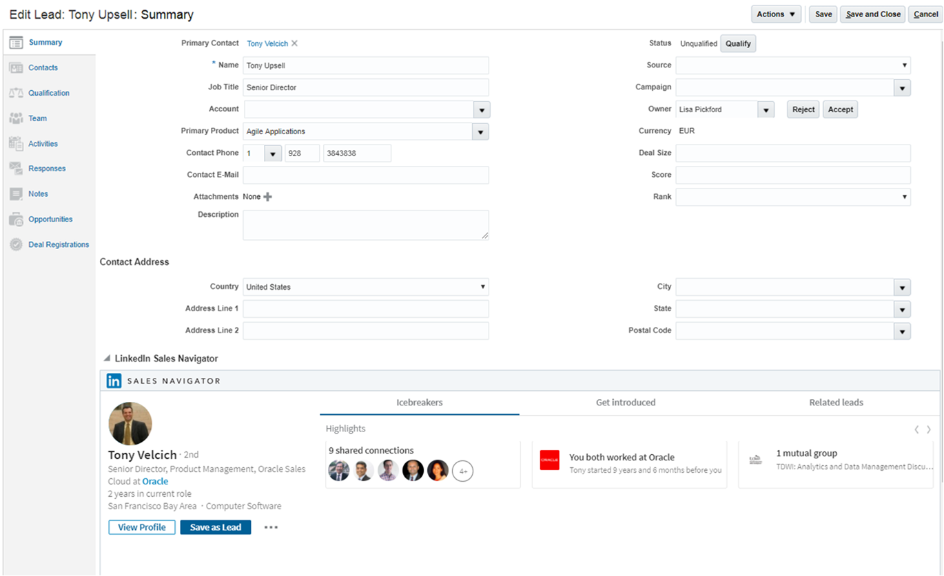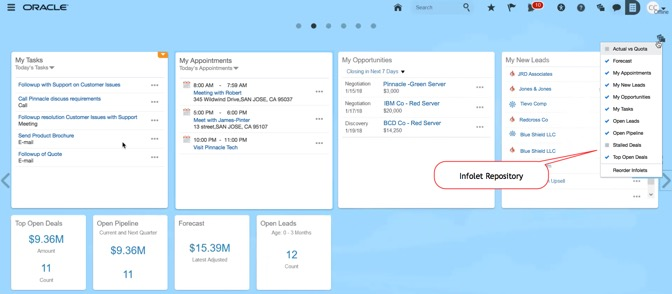 - Infolet-Level Actions: Perform actions, such as creating a lead, opportunity, or task, or open your calendar directly from an infolet.