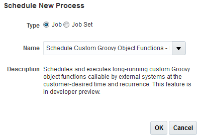 - Search for the Schedule Custom Groovy Object Functions - Developers Preview job.