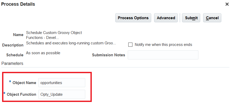- A record must exist for the object for which you defined the object function. Create a record before scheduling the process for object function to be invoked. For example, create an Opportunity record before you schedule the process to invoke the UpdateOppty object function. If there is no record, then the scheduler will fail and Scheduled Process page will show an error in the status of the job.