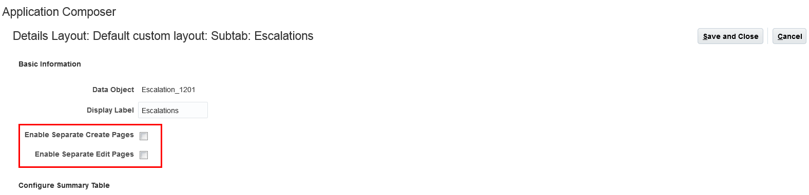 - Select the applicable check box to enable separate Create and Edit pages. The following check boxes are available: