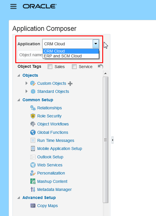 Select an application from a list of available deployed applications in a drop down list in Application Composer supporting ERP and SCM Cloud extensibility. If you have deployed ERP and SCM Cloud and CRM Cloud, then you can use the Application drop-down list to switch between these two families.