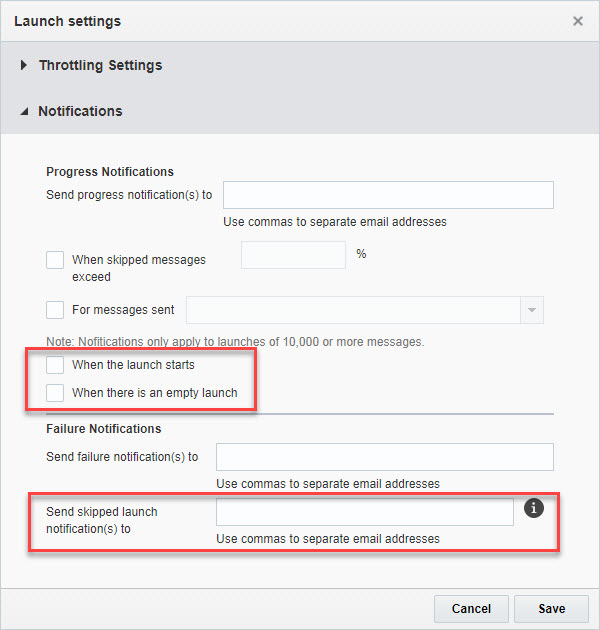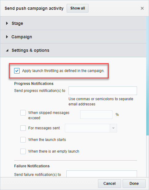 - Select Apply launch throttling as defined in the campaign checkbox in the Settings & options section.