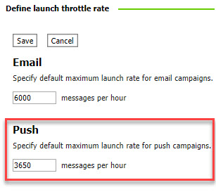 You can now specify a launch throttling rate for Push campaigns. Launch throttling controls the number of push messages sent per hour.