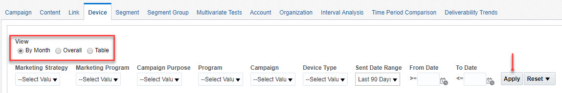 Based on your analysis needs, you can switch between three views of the data: a monthly view, an overall view, and a tabular view. The tabular view provides a great way to identify the device types, browsers, and OS's with the highest engagement rates.