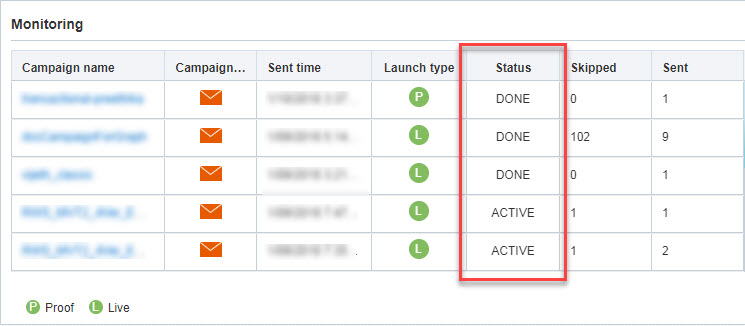 The Monitoring section of the Home page now displays the launch status of the campaign instead of the abbreviated version.