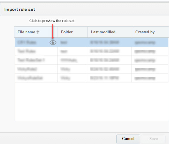 . - In the Import rule set dialog, select the rule set, then click Save.
