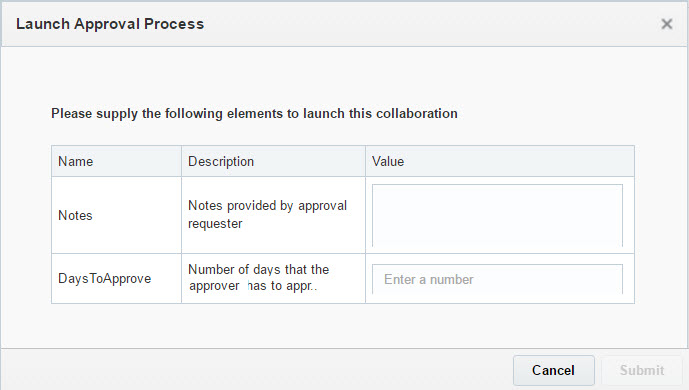 - In the Launch Approval Process dialog, type any notes for the approver and enter the number of days that the approver has to complete this task, then click Submit.