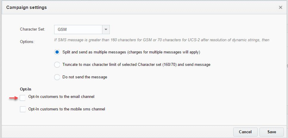 - If you do not want MO senders to be opted in to the email channel, clear the new Opt-In customers to the email channel checkbox in the Campaign settings section of the Campaign Workbook.