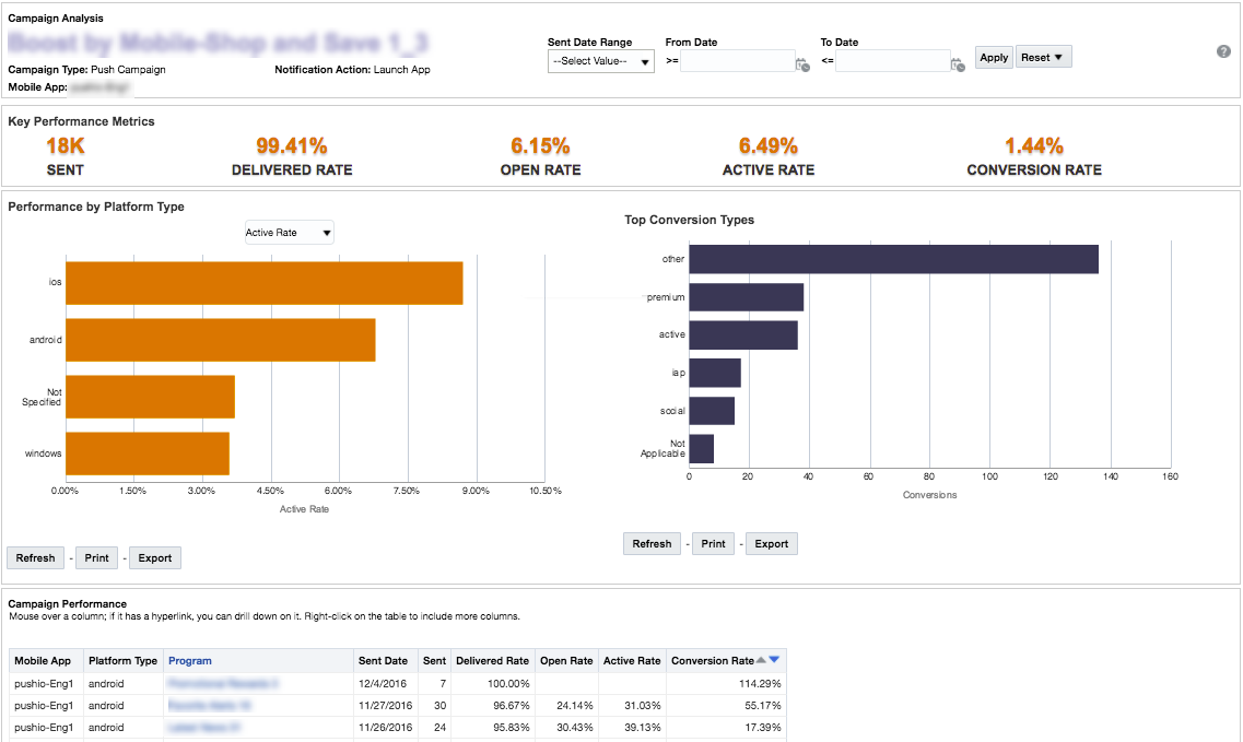 For Rich Push campaigns, you can analyze link clicks or clickthrough rates at an aggregate level by app or campaign.
