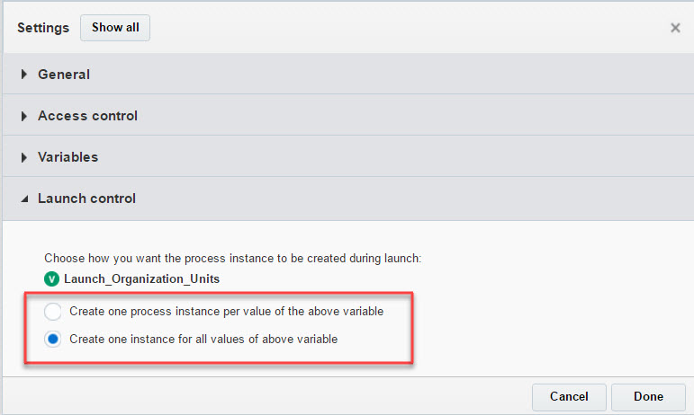 - One process instance per value of the selected organizational unit