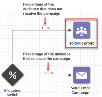 To create a holdout group, use the new Holdout group activity to specify the percentage of the audience that should not receive the campaign. You can select all campaigns in the flow, or a specific campaign.