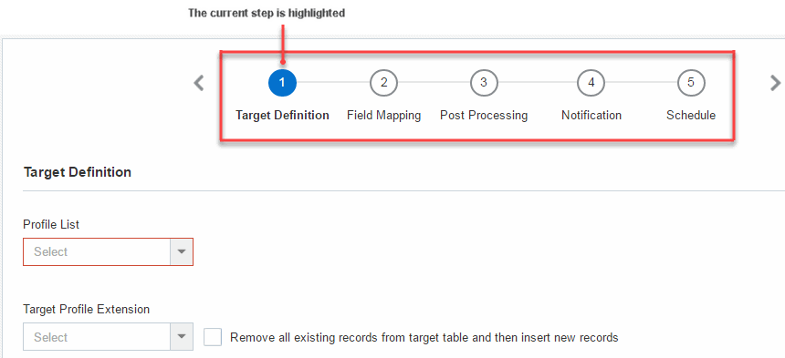 - Click each step in any order to configure and schedule the job.