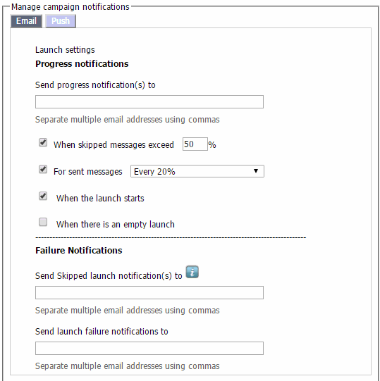 The Account Administrator can now manage all progress and failure notifications for Email and Push campaign launches and split-run launches for the account.