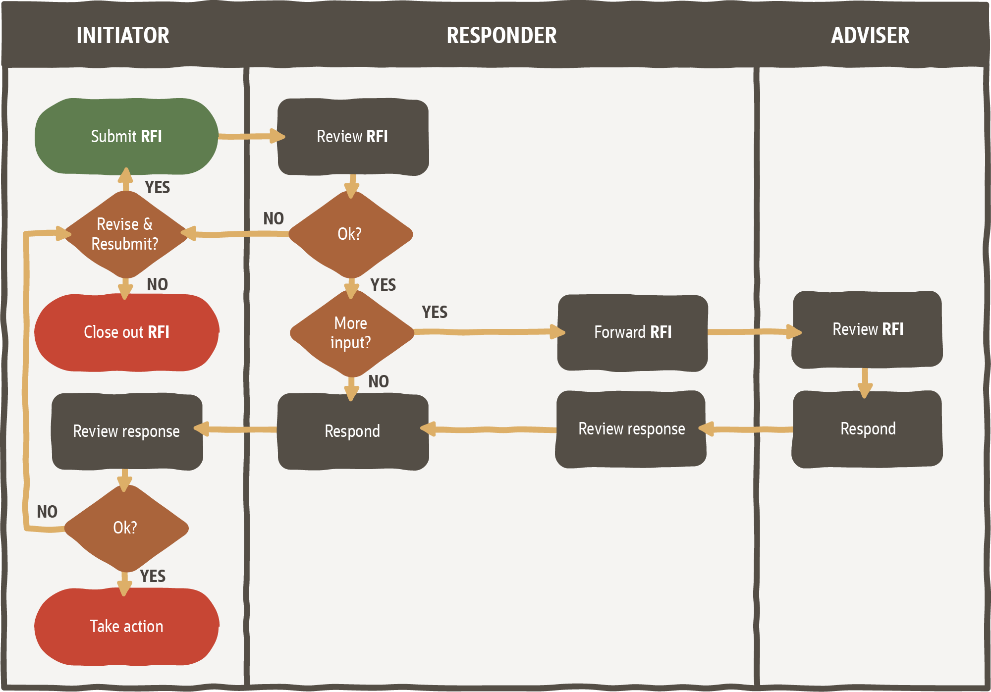 The swim lane headings are generic here. This means it could work for a number of different scenarios. For example, a sub-contractor might start the process or, maybe the main contractor does.