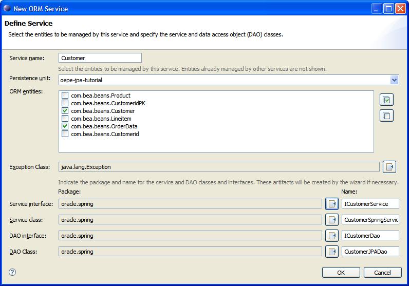 to add a new Spring ORM service to use the JPA entities. Fill in the required fields as illustrated.
