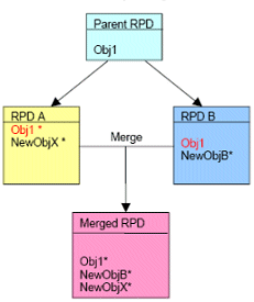 標準の3方向マージ(共通の親を使用した3方向マージ): 共通の親リポジトリと2つの派生したリポジトリを使用している場合、このマージが有用です。 たとえば、共通の親リポジトリから派生した開発リポジトリと本番リポジトリがあります。 開発リポジトリから本番リポジトリに変更をインポート/マージできます。 この場合の3方向マージ・プロセスを左側のダイアグラムに示します。ここでは、Parent RPDと2つの派生したRPD(RPD AとRPD B)があります。 マージのあと、4つ目のマージされたリポジトリ・ファイル(ダイアグラムのMerged RPD)が作成されます。 (変更されたオブジェクトまたは新しいオブジェクトは*(アスタリスク)を追加して記述します)。 RPD Aでは、Obj1オブジェクトが変更され、新しいオブジェクトのNewObjXが作成されています。 同様に、RPD Bで新しいオブジェクトNewObjBが作成されます。 これらの2つのリポジトリをマージする場合、親から継承されてRPD Aで変更されたobj1と2つのリポジトリの新しいオブジェクト(NewObjX、NewObjB)がマージされたリポジトリに含まれていることを確認します。
