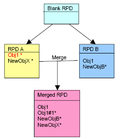 共通の親を使用しない3方向マージ: これは、共通の親を使用しない2つの異なるリポジトリのオブジェクトをマージする特殊なマージです(2方向マージとも呼ばれます)。 たとえば、管理者として、異なるリポジトリから現在または作業中のリポジトリにオブジェクト(サブジェクト領域、フォルダなど)をインポートできます。 この場合、マージするリポジトリに共通の親が存在しません。 右側のダイアグラムでこのシナリオを示します。 この場合、2つのリポジトリが個別に扱われ、マージまたはインポートの実行中に競合するオブジェクトの名前(接尾辞#Nを使用、Nは数値)が複製されます。 ダイアグラムは、RPD AおよびRPD Bが個別のリポジトリとして扱われて空のリポジトリに対応している共通の親を使用しないシナリオを示しています。 この場合のマージ・プロセスは、Obj1を上書きしません。代わりに、RPD AとRPD BからObj1(Obj1、Obj1#1*)のコピーがマージされたリポジトリに保存されます。 また、2つのリポジトリの新しいオブジェクト(NewObjB*、NewObjX*)がマージされたリポジトリに作成されます。