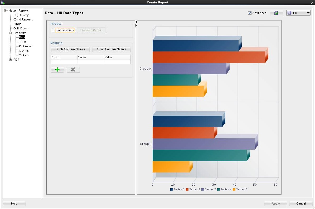 When a report is assigned a connection, in this case HR, you can preview the chart with live data. Select Use Live Data.