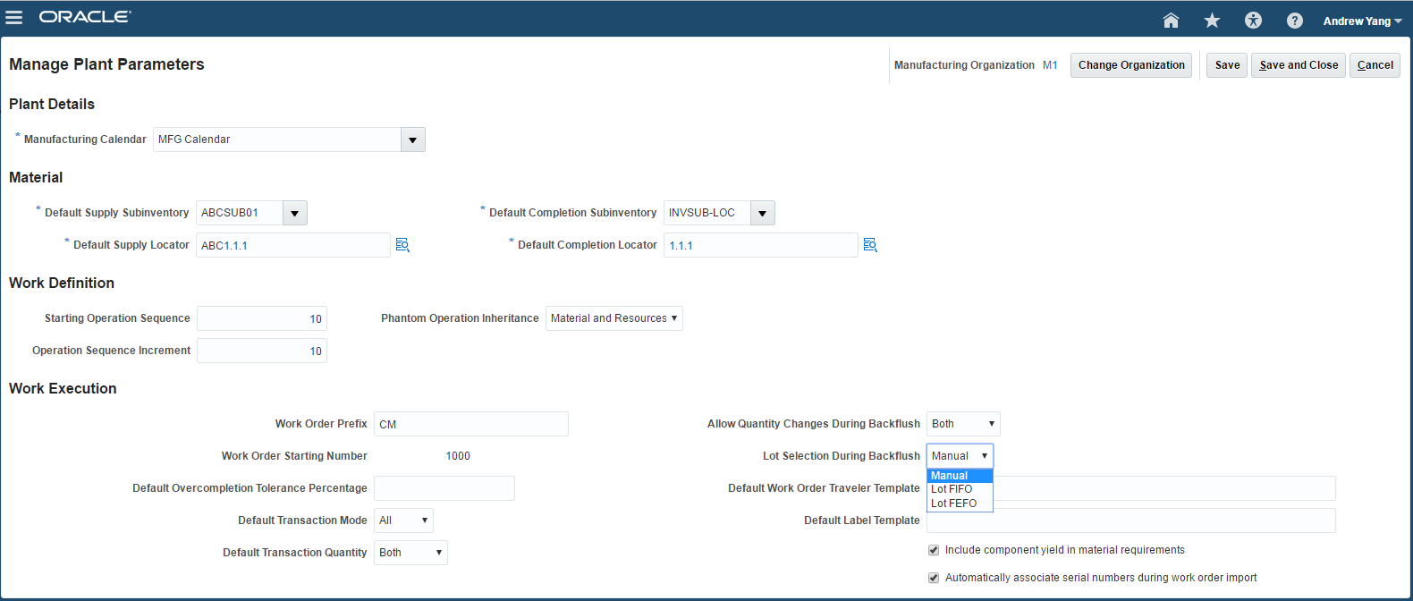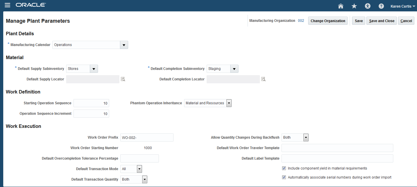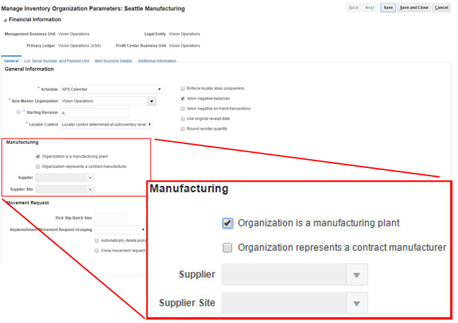 - Enable the inventory organization as a Manufacturing Plant. Click Save.
