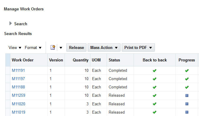This feature provides robust capabilities that allow production supervisors to efficiently create and manage work orders. Production supervisors can search work orders using basic or advanced search, and personalize and save the search criteria. In addition, they can create standard and nonstandard work orders, update or edit work order operations, update or edit priorities, edit and manage work order status, pre-assign serial numbers, view production progress, monitor production transaction history, and print component lists and work order travelers.