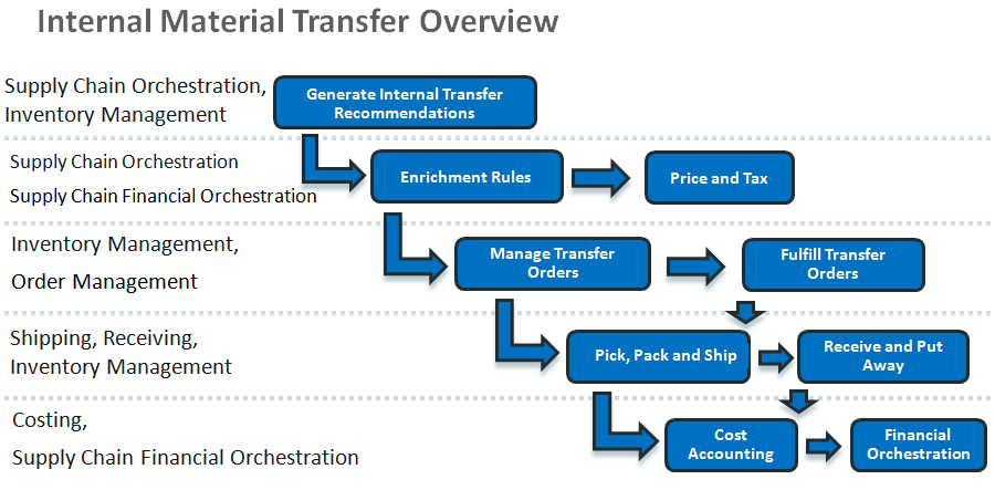 Supply Chain Orchestration uses a transfer order document that can handle the physical movement of inventory between the shipping organization and the receiving organization. It uses this document to process an intraorganization, interorganization, or intercompany transfer. Warehouse personnel can pick, ship, receive, put away, and return items through the same transfer order document. Users save time because Supply Chain Orchestration processes these transfer orders in the same way that it processes shipments and receipts that do not involve an internal material transfer. You can use the Manage Transfer Orders page to access transfer order details, such as transfer price, source organization, destination location, requested quantity, and line status.