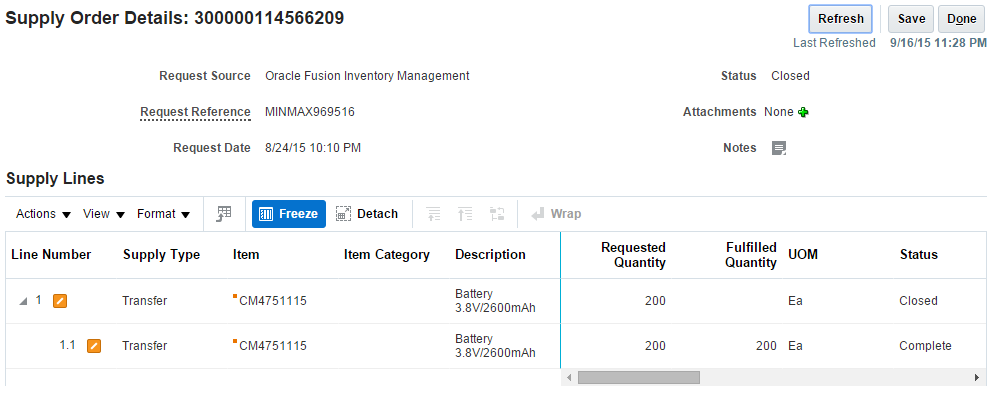 Receive constant visibility into the Oracle SCM Cloud processes that create supply. Use summary views to monitor progress, view errors, and manage exceptions that might jeopardize supply from meeting demand. Use the Supply Chain Orchestration work area to view errors, take corrective action, resubmit to continue processing, or drill into supply details to monitor each task and task progress. Open documents directly from the Supply Chain Orchestration work area to view important information