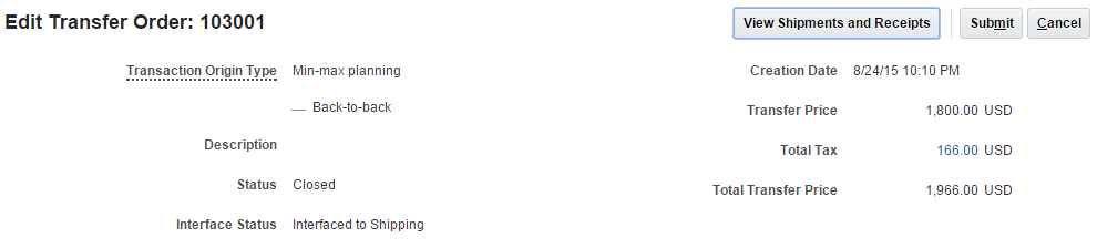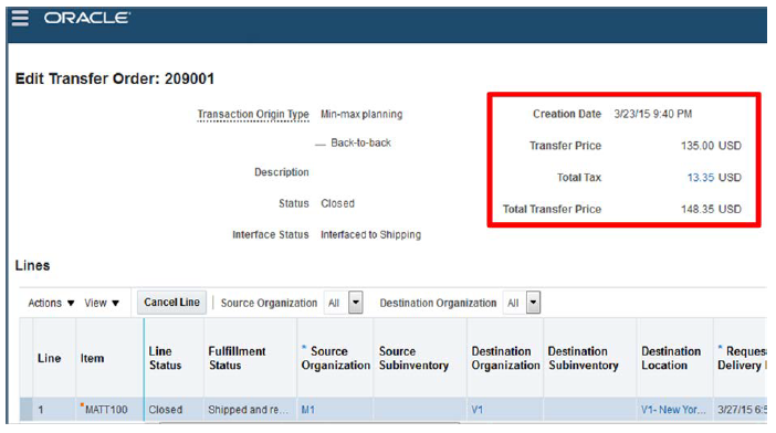 Oracle Fusion Supply Chain Financial Orchestration calculates the transfer price and taxes for an internal transfer when it creates the transfer order. Use the following page to examine and reconcile this price and tax:
