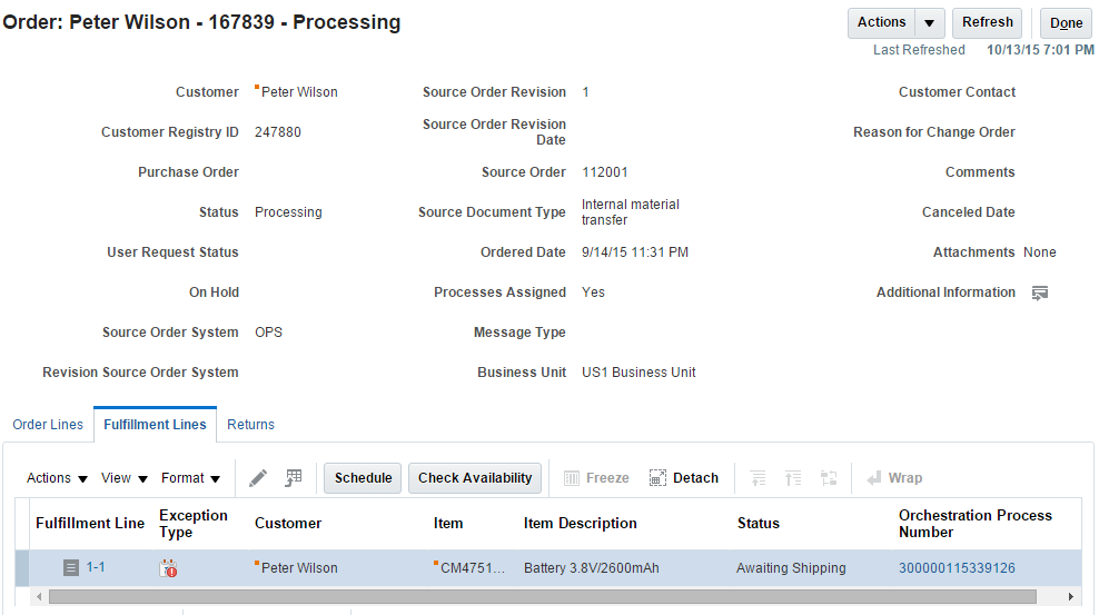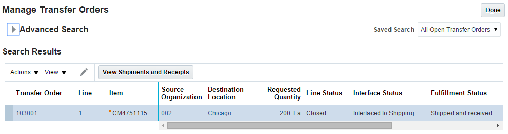 You can monitor line status, fulfillment status, and interface status, and can examine quantity details, including requested, shipped, and received quantities. You can also edit a transfer order; for example, you can edit the source organization, requested delivery date, requested quantity, and so on.