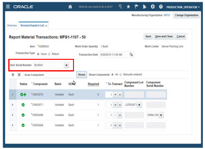 The dispatch list gives operators a single location where they can view production priorities and run production tasks for their work center and their shift. The operator can start and end the day with only the dispatch list. The operators can record all production activities for work orders, such as operation completions, scrap, reject, material, and resource transactions. To aid the execution of the daily tasks, operators can print work order traveler, labels and other production documents. Use ready-to-use integration with scanning devices, to get touchless reporting data on material transactions, for components that are controlled by serial numbers or lot numbers.