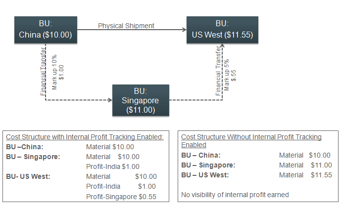 Cost Management uses a profit in inventory cost element to track profit earned on each internal transfer so that you can view internal markups in an intercompany trade flow. If you allow this profit tracking, then a cost accountant can view the profit earned during each part of the transfer. In the following example, you can view goods received in the US West business unit at a price of $11.55, and you can also view the profit that the Singapore and China business units earn, and the original cost of the material. You can analyze goods received according to the profit that each business unit earns: