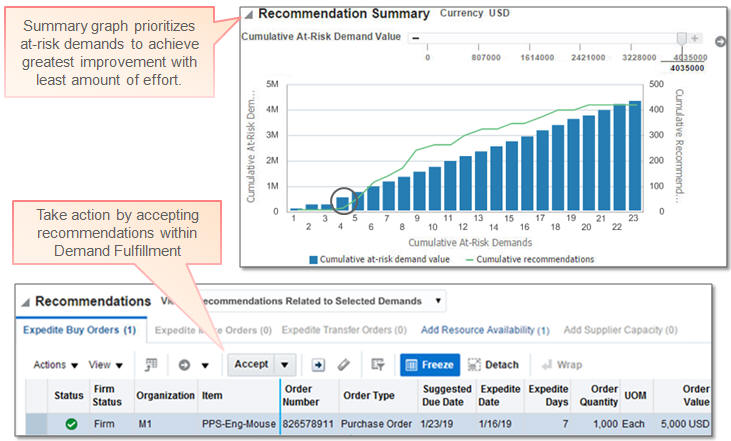 Immediately adjust to changes in demand or supply to minimize risk in the supply chain. Support changes in supply and demand and automatically take corrective action or, if an action cannot be run, then send an alert to the Oracle SCM Cloud.