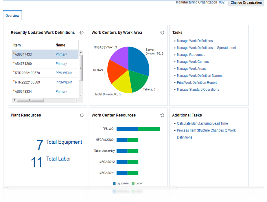 Oracle Manufacturing Cloud provides the ability to define the manufacturing plant and associated setup using an easy standard data model resulting in reduced setup time, and allows to adapt to changing business processes and market conditions. This allows the manufacturing engineer to define, view, and update the manufacturing plant data and the relationships that exist between entities, including the following items: