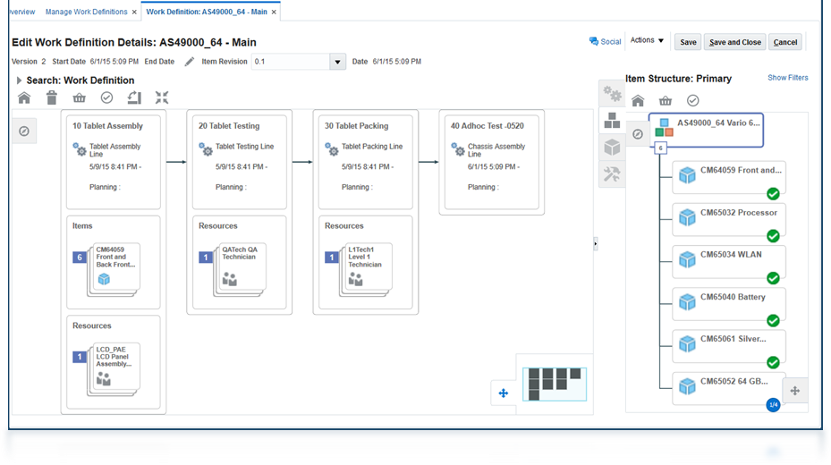 Manufacturing engineers can visually design a work definition that represents the discrete manufacturing process, materials, and resources needed to make a standard or assemble-to-order product. With simple drag-and-drop interactions and data visualization views, you can easily build a sequence of operations and specify how each operation is executed. For example, use push or pull components, count point or backflush materials, automatic resource charging, and product serialization.