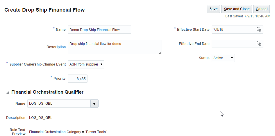 You can use Oracle Business Rules to configure and manage the documents that Supply Chain Orchestration uses when it routes a flow to the Oracle SCM Cloud. Release 11 includes predefined business rules that are ready to use. You can configure them to implement custom processing. You define the business conditions that determine the rule to use.