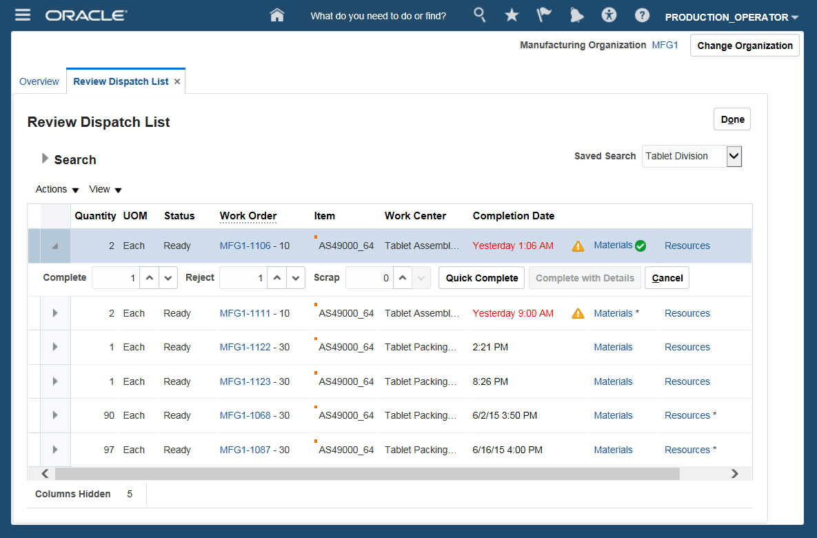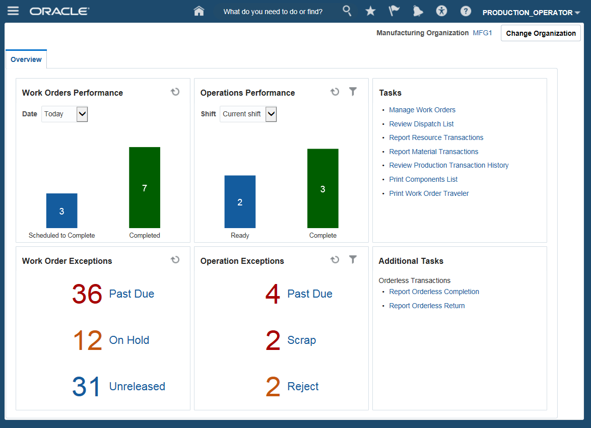 Oracle Manufacturing Cloud provides capabilities that allow production supervisors and production operators to manage, execute and report production activities through an enhanced user interface with focus on productivity.