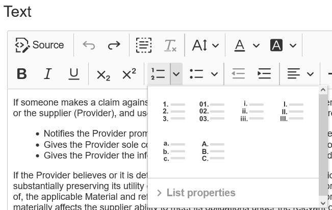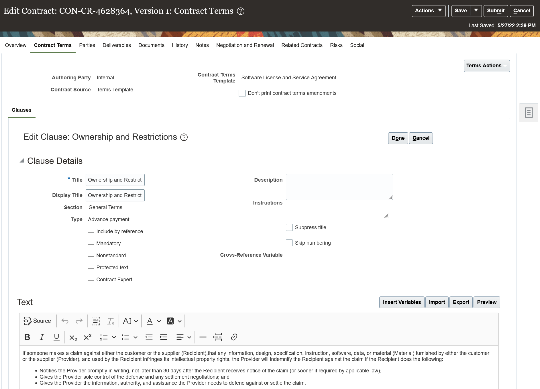 Use the latest built-in rich text editor when editing clause text in Oracle Enterprise Contracts.