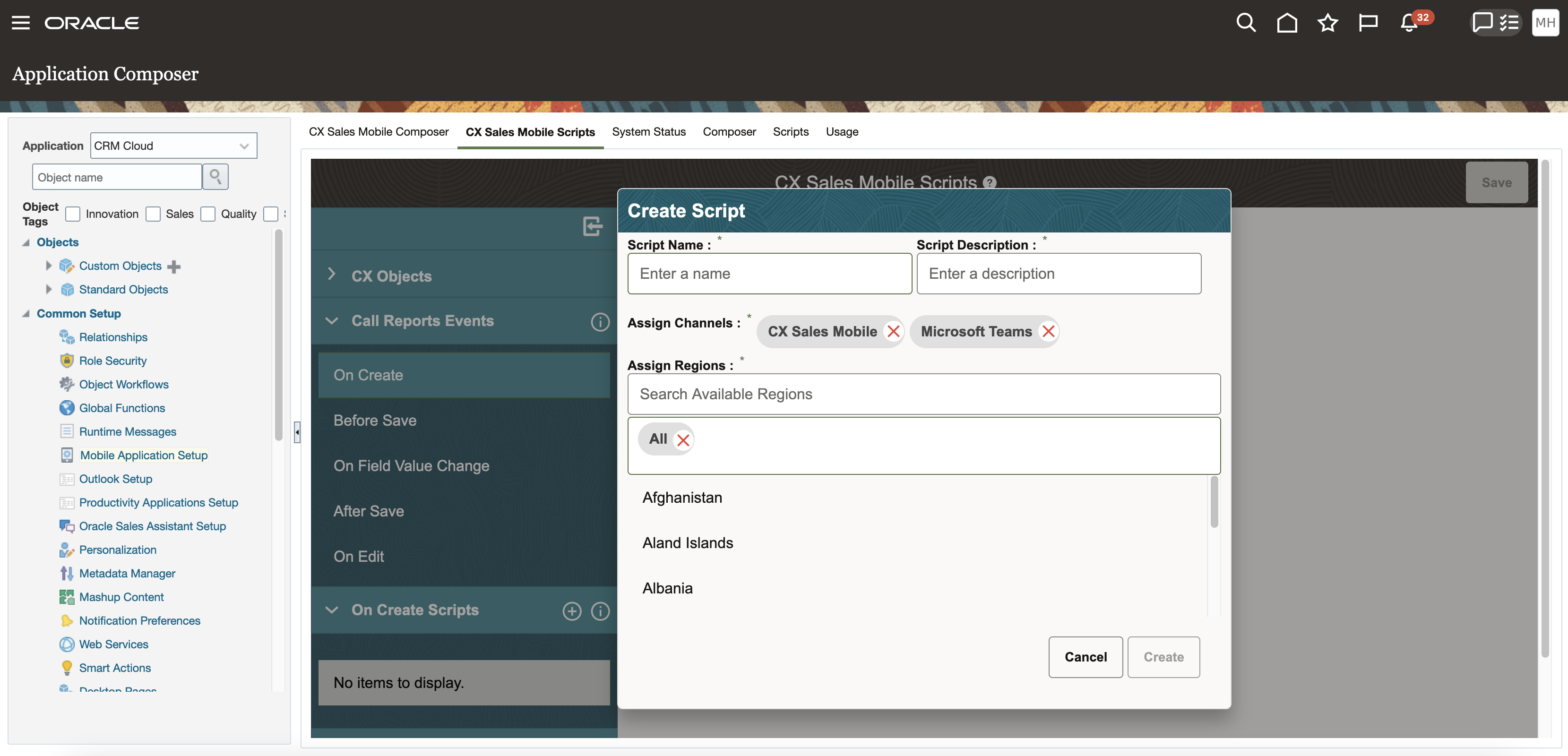 Oracle Sales Assistant in Microsoft Teams supports conversational creation of tasks, appointments, and call reports. Use the CX Sales Mobile Scripts tool to assign existing scripts to the Microsoft Teams channel for Oracle Sales Assistant. You can create custom scripts that can be triggered on for the On Create, Before Save, and After Save events. For example, a custom script can be triggered when a Microsoft Teams user creates a call report using the sales assistant. Or, you can trigger a script to validate or enforce some rules before or after a call report is saved.