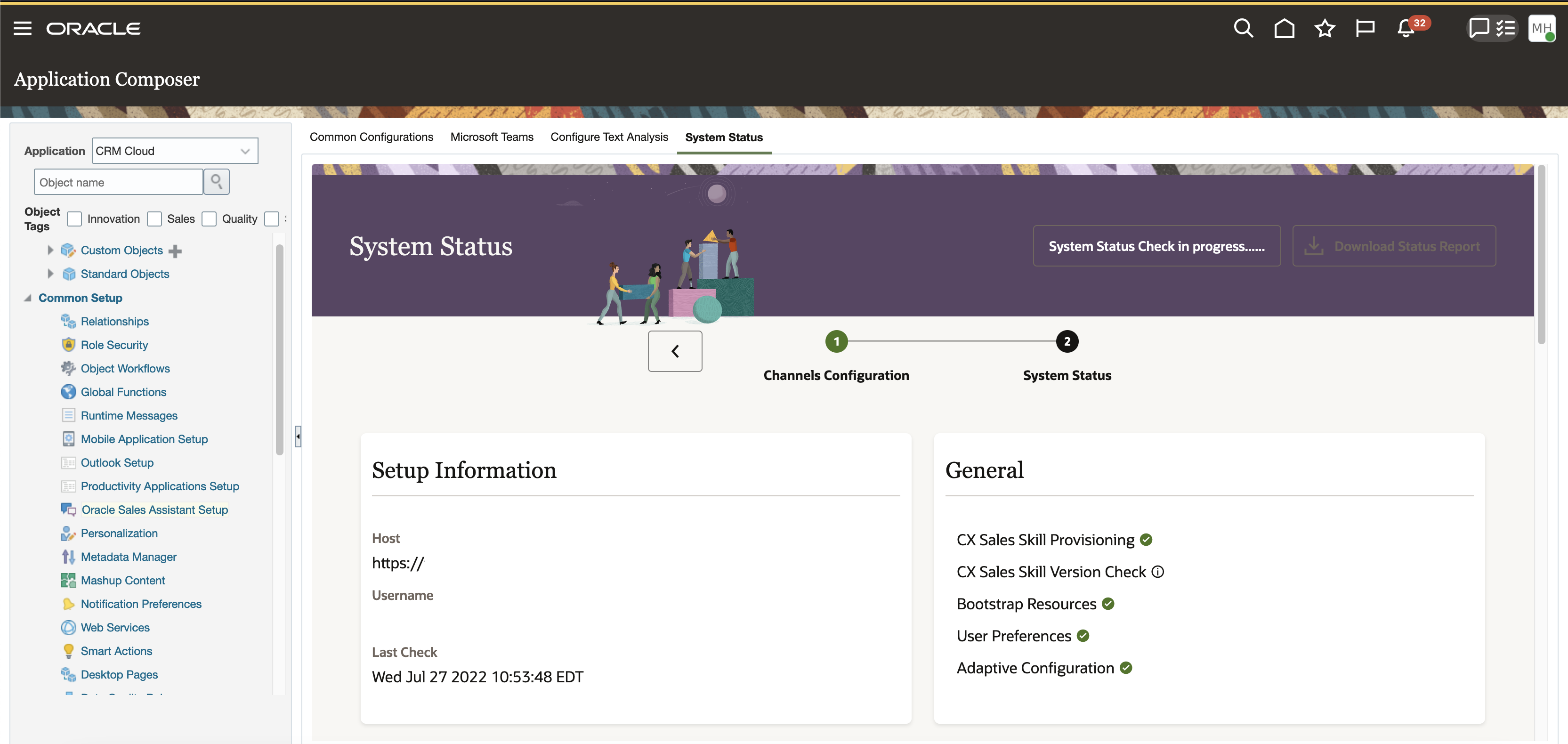 - When inside a sandbox, access the Oracle Sales Assistant system status tool from Application Composer > Common Setup > Oracle Sales Assistant Setup > System Status.