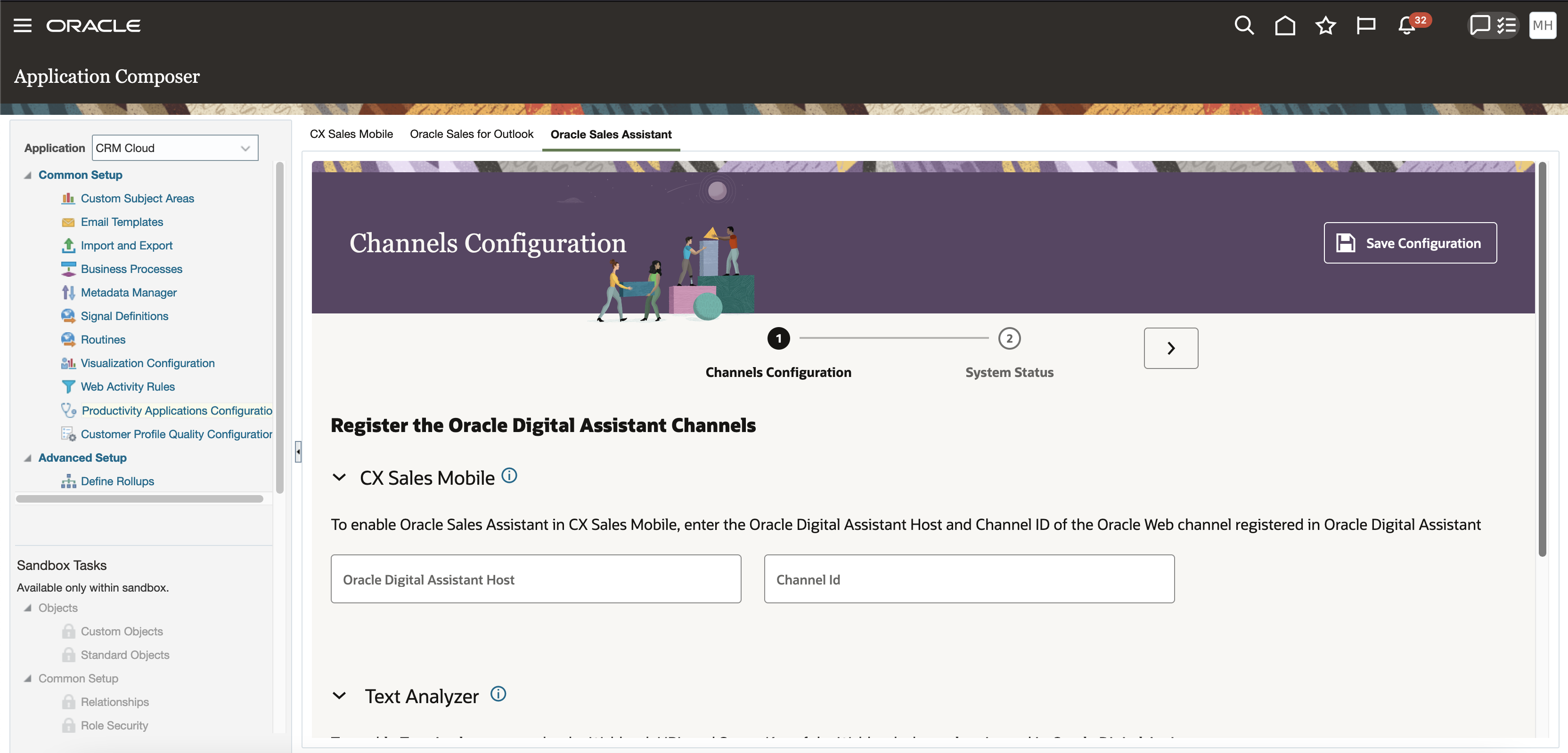 - When outside a sandbox, access the Oracle Sales Assistant configuration tool from Application Composer > Common Setup > Productivity Applications Configuration > Oracle Sales Assistant. The configuration tool contains both the Channels Configuration tab and the System Status tool.
