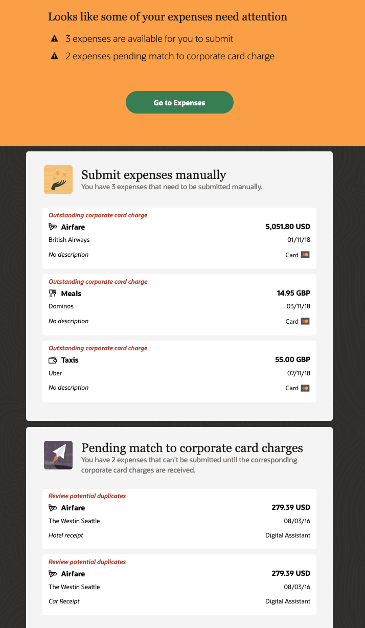 - View Expenses Requiring Attention in Oracle Digital Assistant