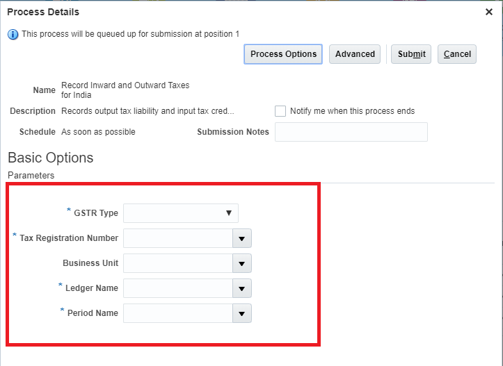 - Search for the Job: Record Inward and Outward Taxes for India. Run the Process.