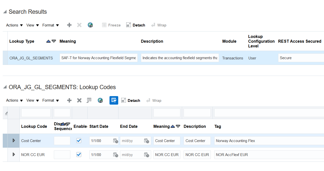 - ORA_JG_SAFT_FORMAT lookup: This is a predefined lookup that contains the values Norway and Generic values as options for the Format Type parameter. When you select the value as Norway for Format Type parameter, the Extract Type parameter is set to Accounting Journals, the Selection Date Type is set to Accounting Date, and the Asset Book parameter is ignored because the report for Norway is based on GL Journals only.
